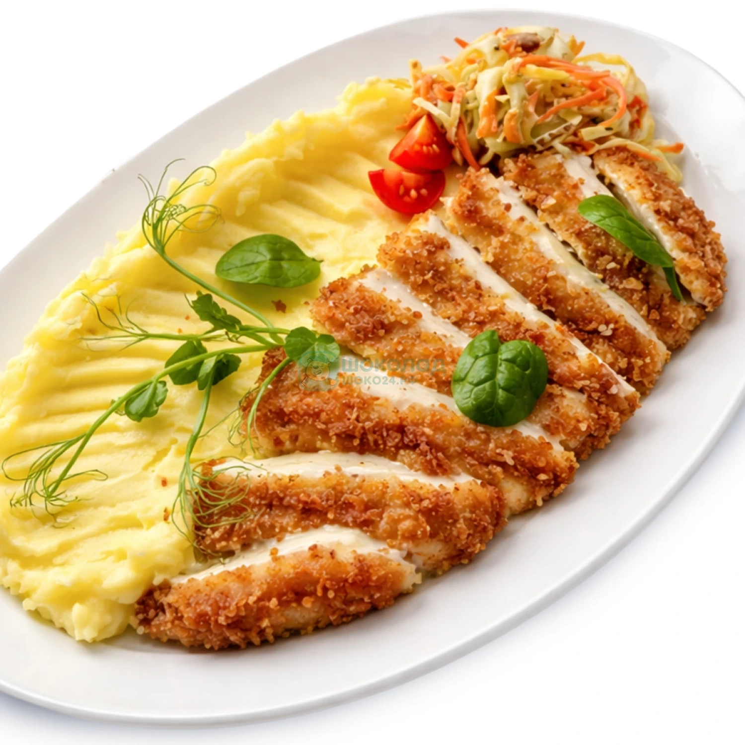 Нежное филе в хрустящей панировке с воздушным пюре.
