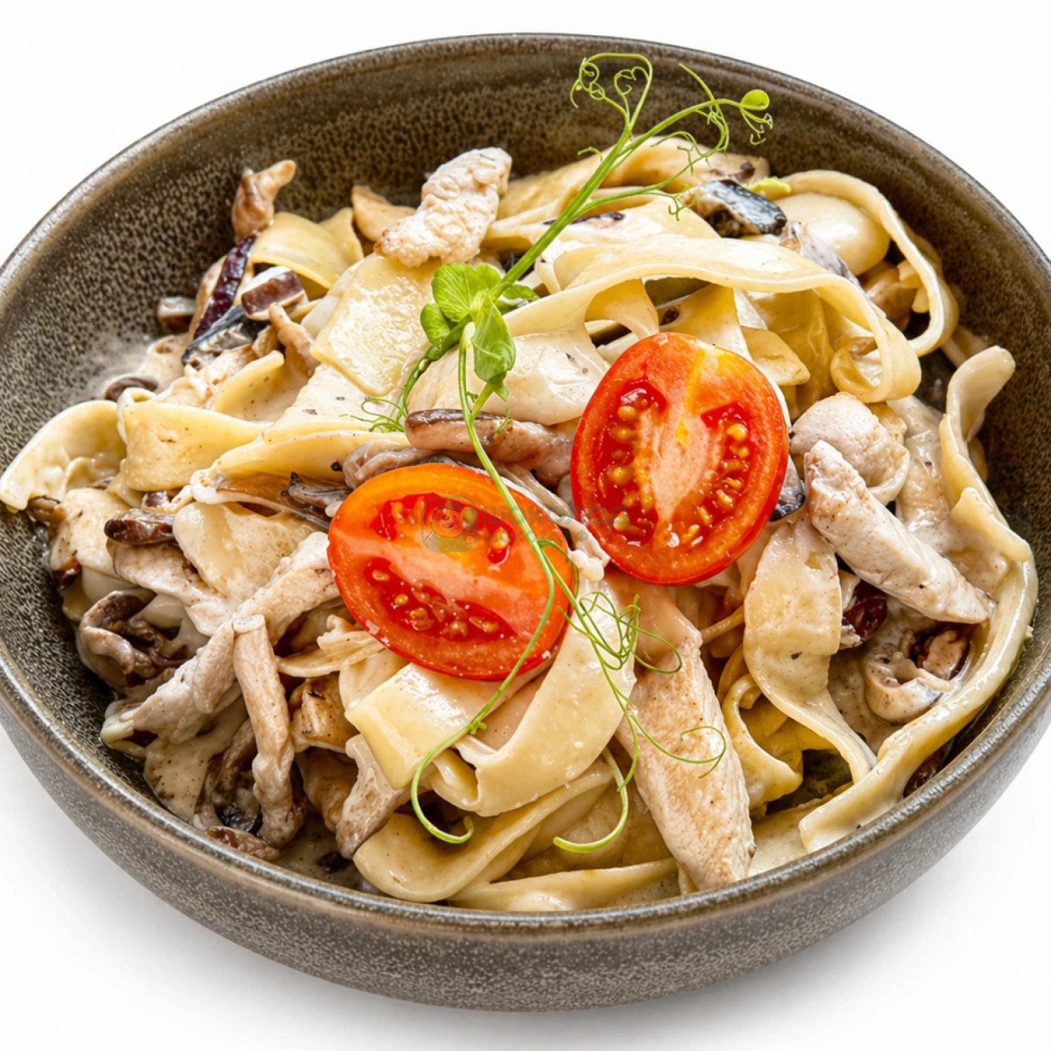 Куриное филе, красный лук в сливках с сыром пармезан.