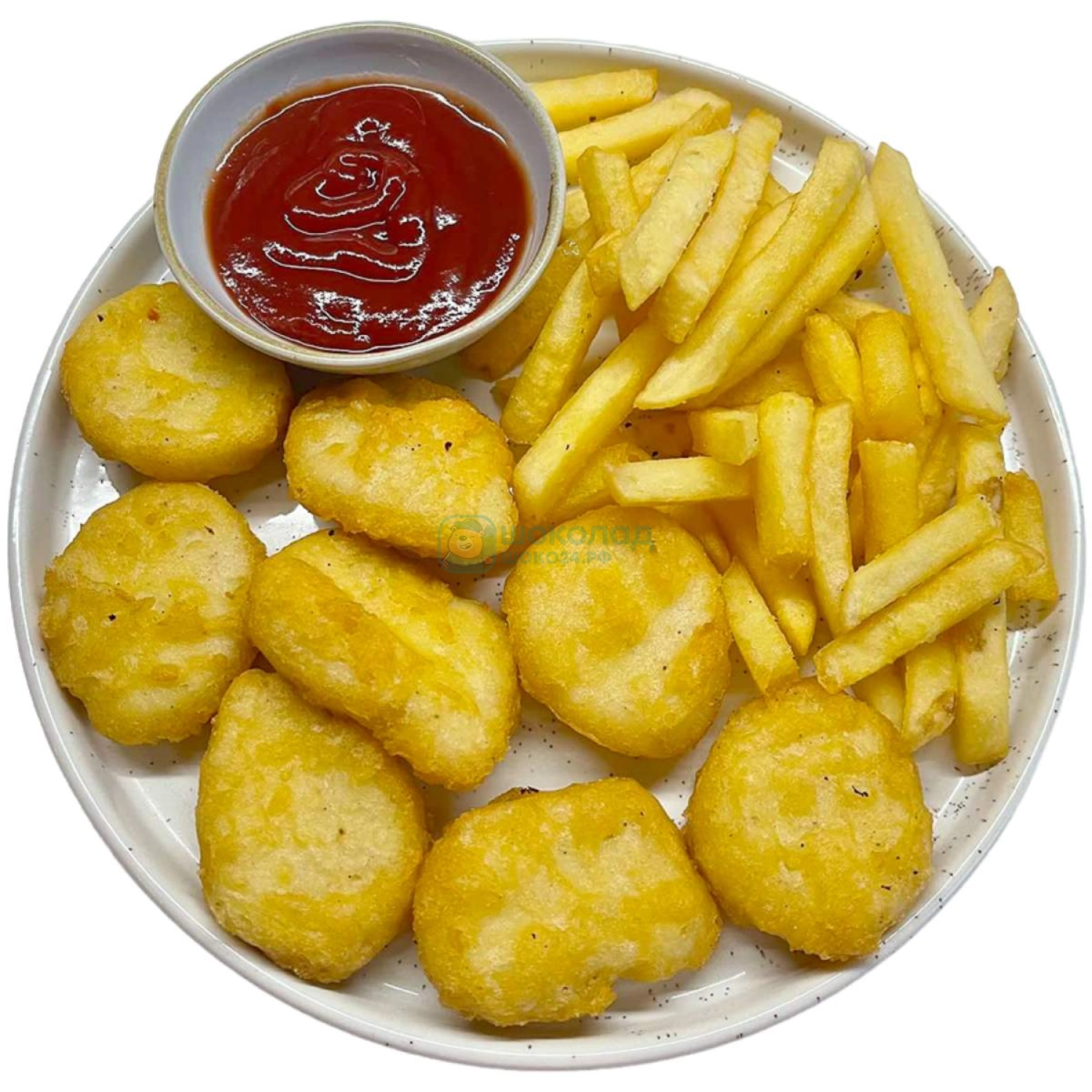 Наггетсы + картошка стандартная порция, соус на выбор ( сырный, сливочно - чесночный, кетчуп, пикантный )