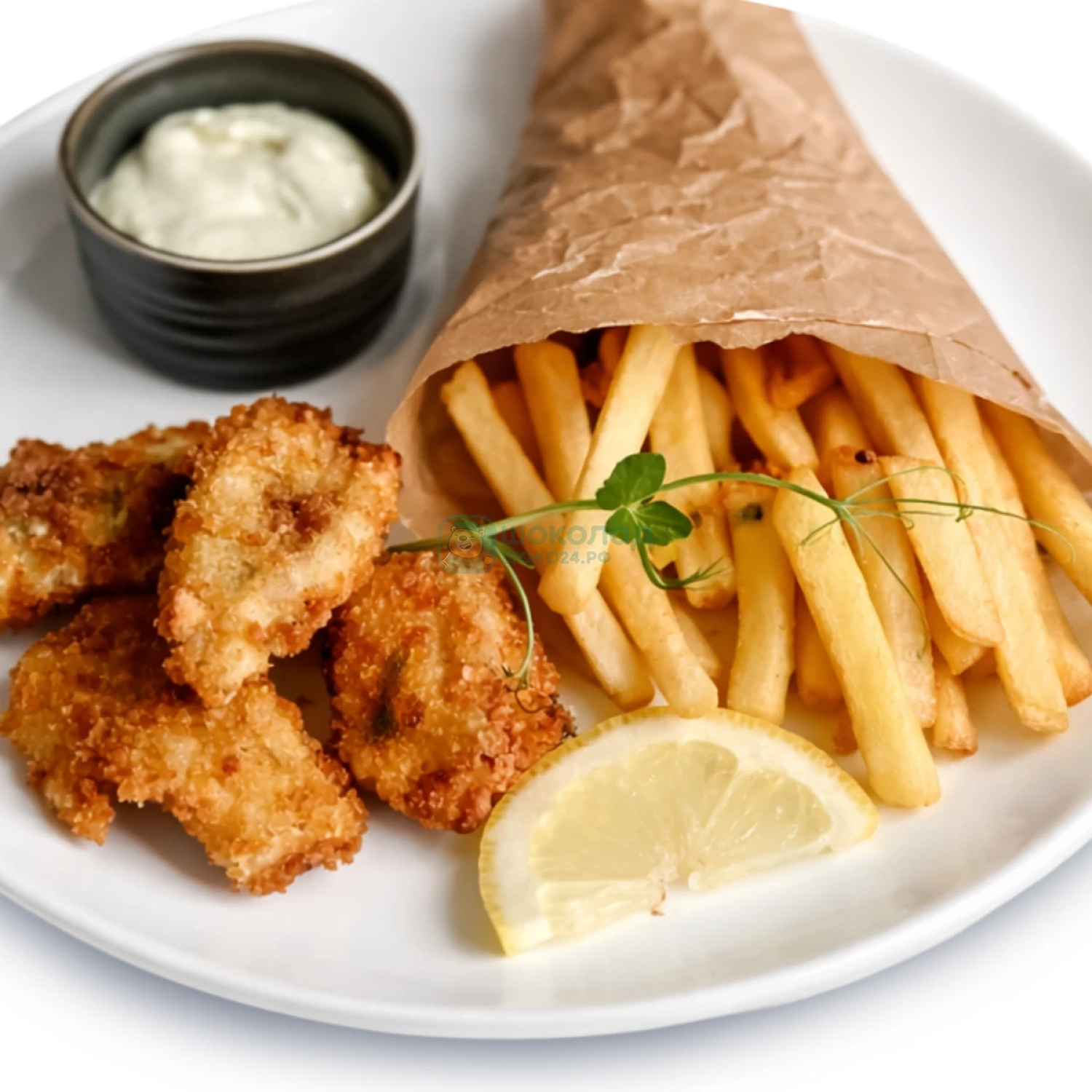 Кусочки филе судака в хрустящей панировке, подаются с картофелем фри и сливочно-чесночным соусом. Идеально для детей и любителей рыбы.