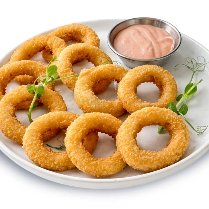 Хрустящие луковые кольца с пикантным соусом.