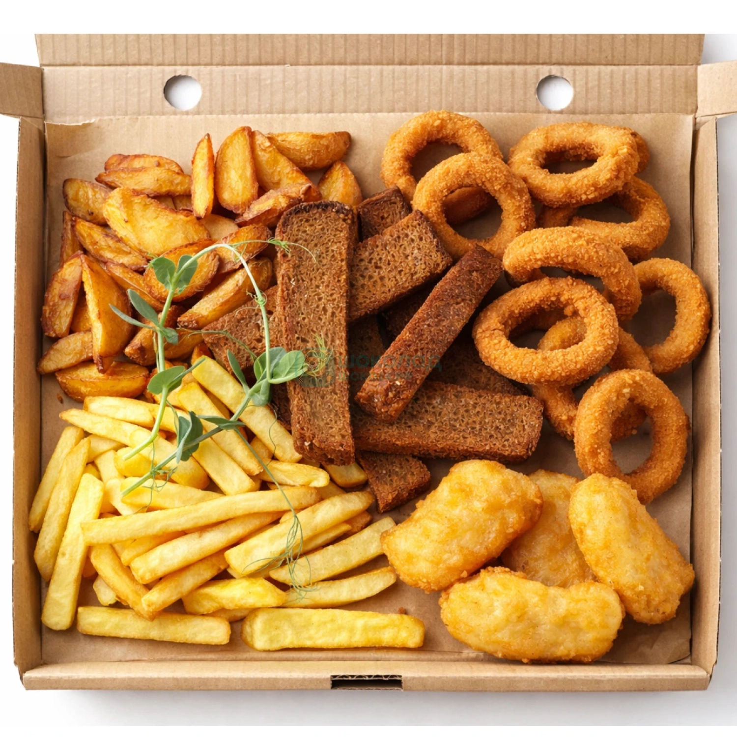Большое комбо из 5 видов закусок в одном комбо + 2 соуса на выбор в подарок! Луковые кольца, картошка фри, картофельные дольки, наггетсы, чесночные гренки. Соус на выбор 2 шт: чесночный, сырный, пикантный, кетчуп.