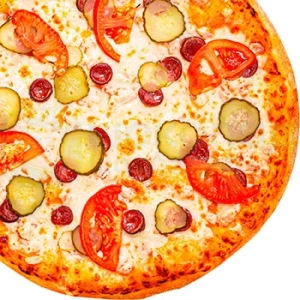 Обжаренная свинина, бекон, колбаски пеперони, маринованные огурчики, томат...
