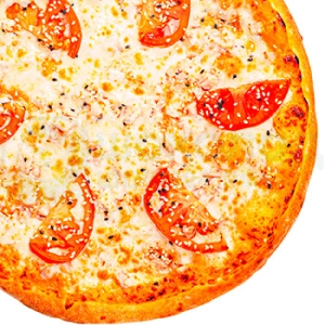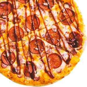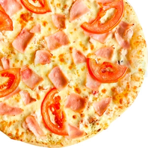 Копченая куриная грудка, колбаски охотничьи, двойная порция сыра Моцарелла, сочные томаты, соус пика...
