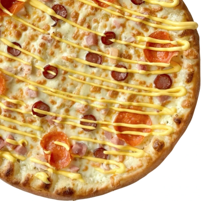Колбаски пепперони, колбаски охотничьи, ветчина, курица копченая, тягучий сыр Моцарелла, сливочно-чесночный соус,