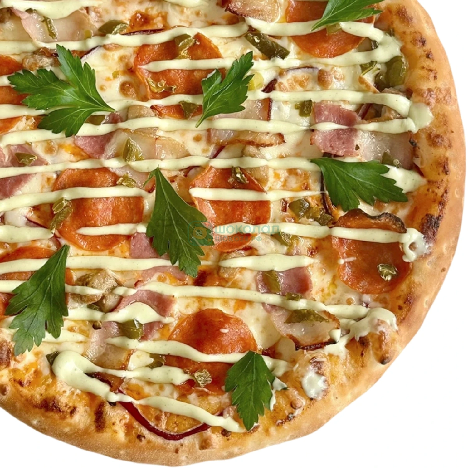 Обжаренная свинина, бекон, колбаски пеперони, маринованные огурчики, томат...