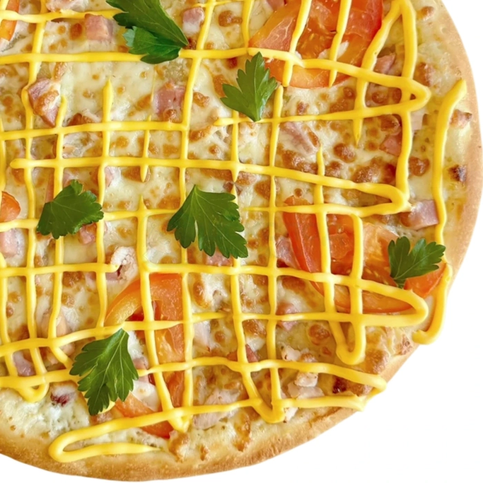 Курочка, ветчина , соус сливочно-чесночный , сырный , сыр моцарелла, томаты,