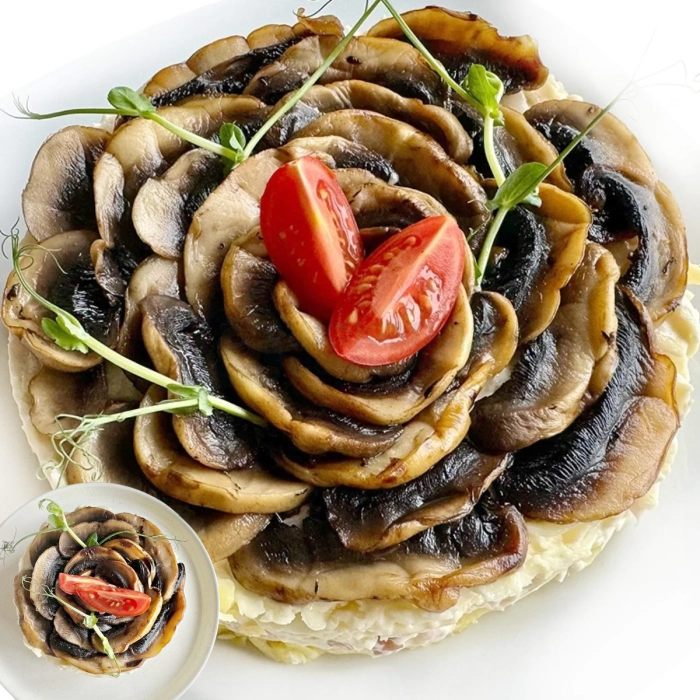 Фирменный салат с морепродуктами в состав которого входит: тигровые кревет...