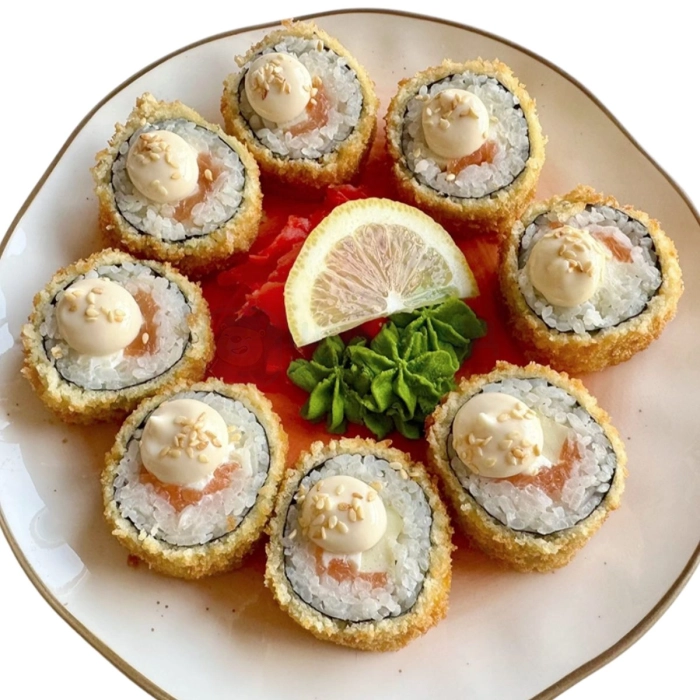 Горячий Вип ролл в Хрустящей панировке с отборным лососем , сыром Филадельфия и японским омлетом, соусом цезарь и кунжутом.