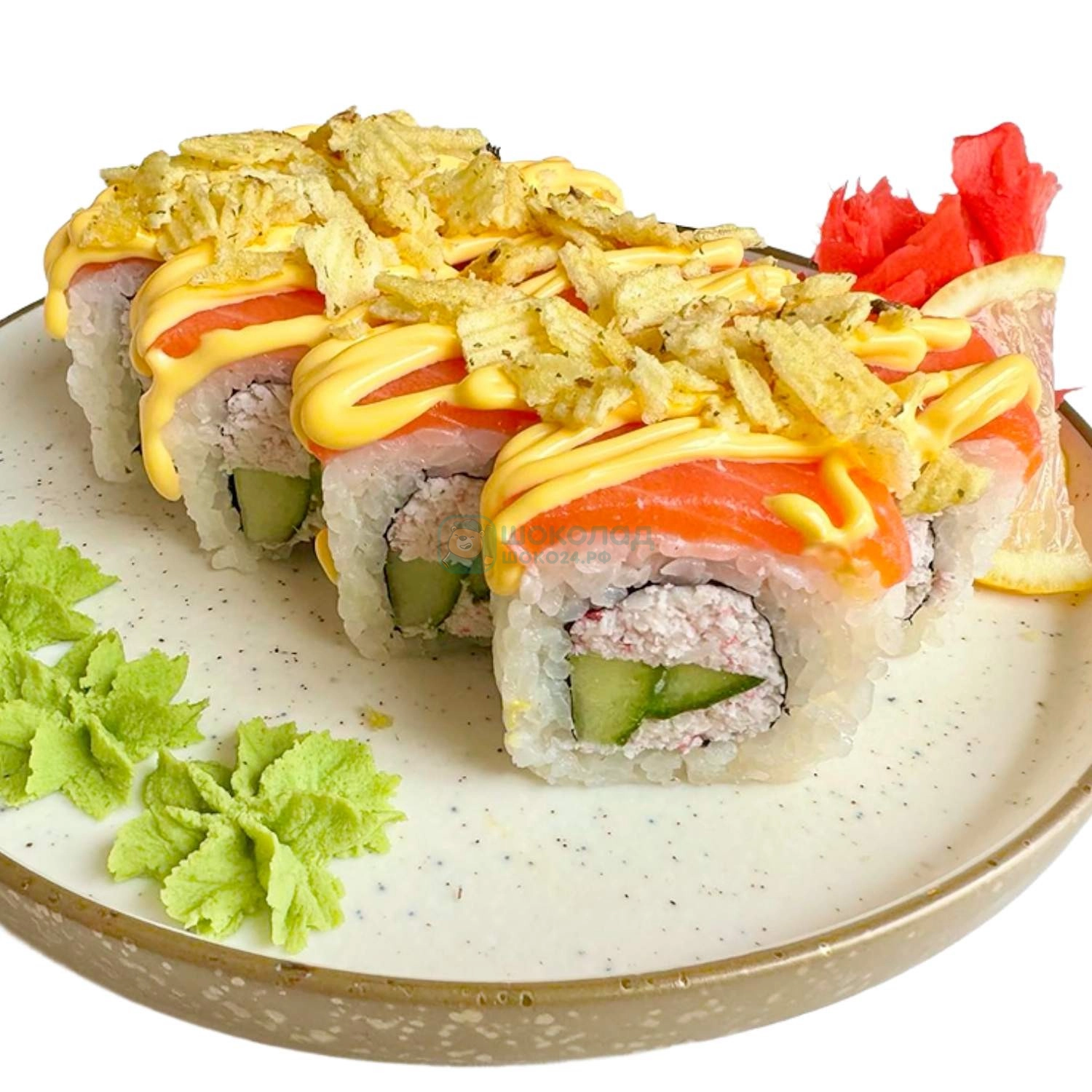 Сочный новый ролл с лососем, крем-краб, огурцы сырный соус, чипсы