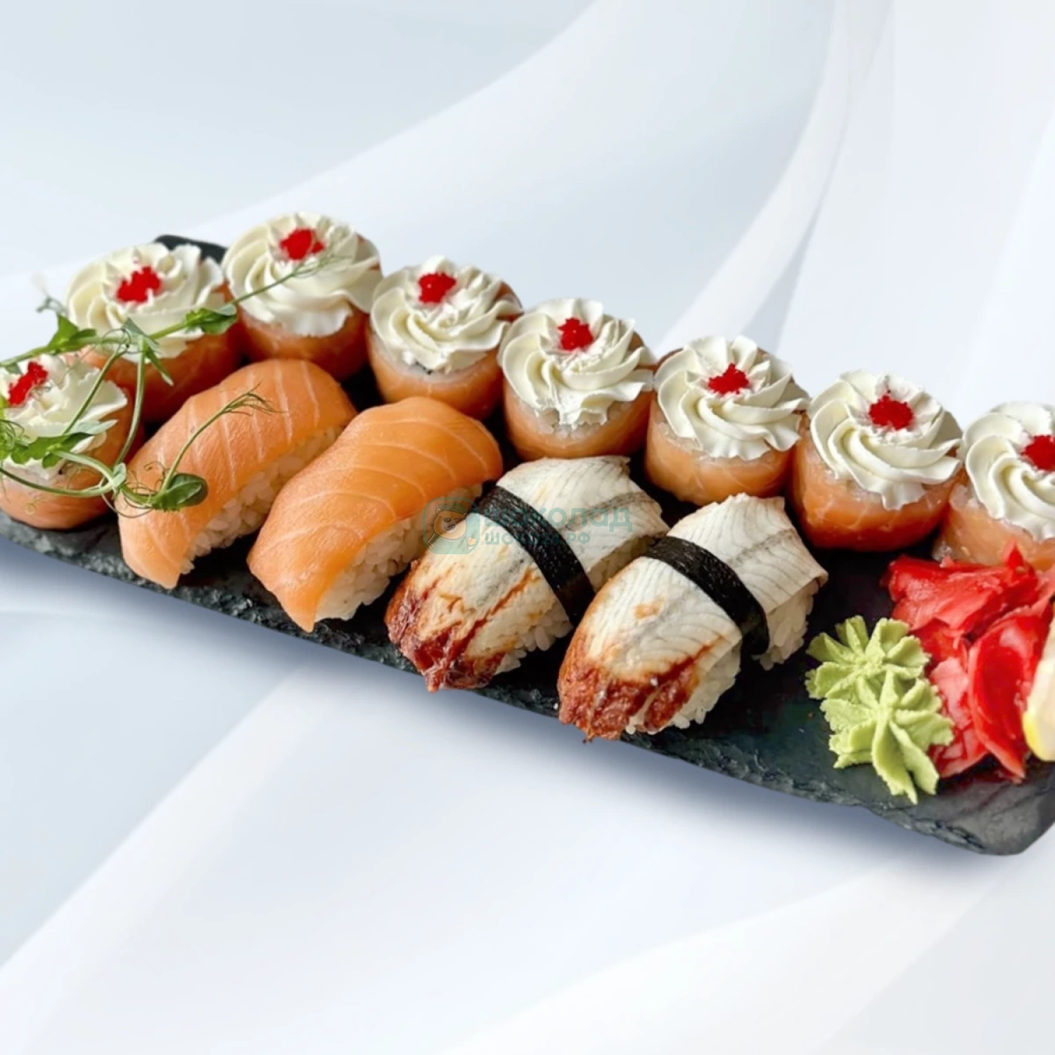 Первый, Новый люксовый сет с суши. Состав: Большой Вип ролл с лососем, 2 суши с лососем и 2 суши с угрем. Оцените вкус этой новинки.