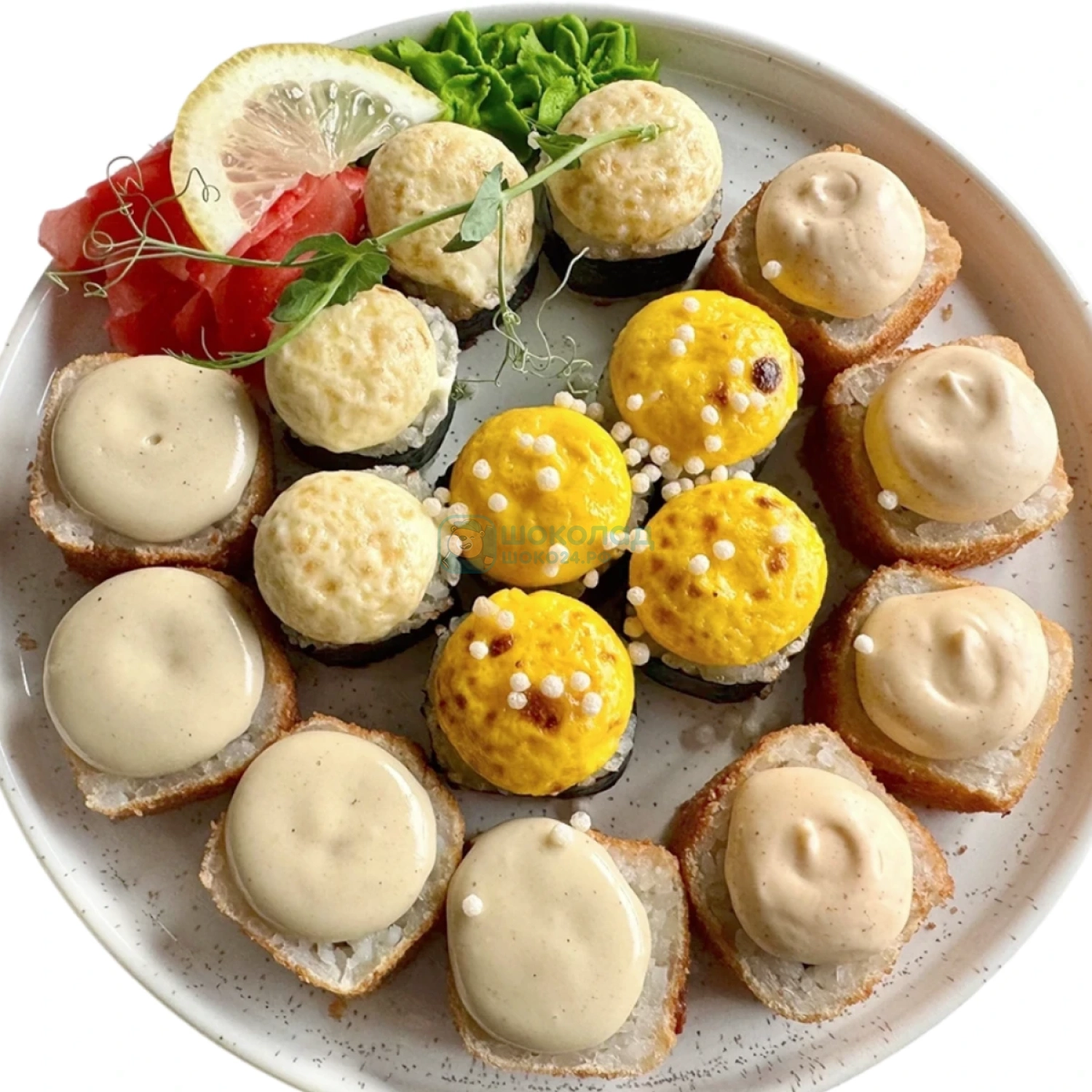 Это сет твоего города. Жаренный ролл в хрустящей панировке с курочкой под шапочкой из соуса цезарь и спайси + запеченный ролл с курочкой под сырной и грибной шапочкой.