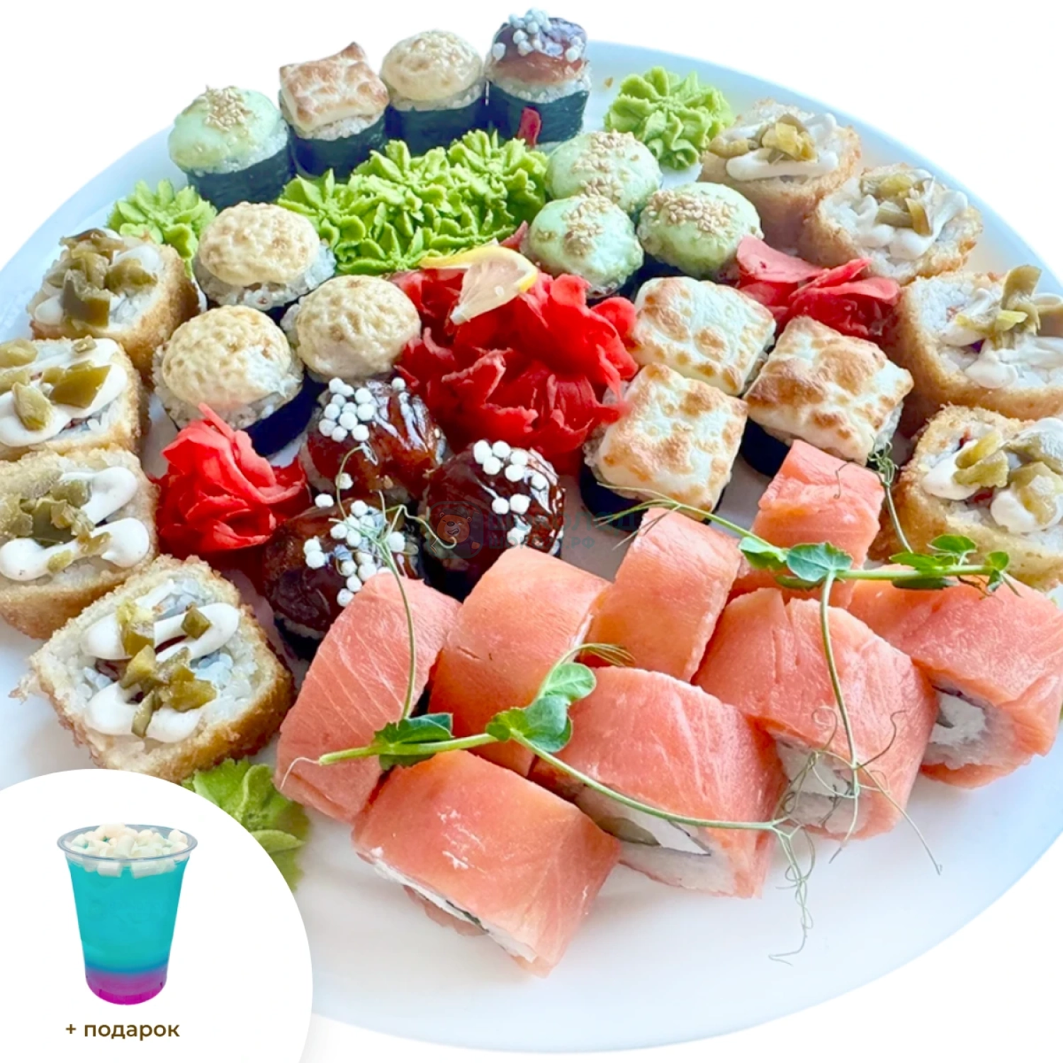 VIP-сет из 4 видов запечённых роллов: с лососем и угрём под авторскими шапочками, «Филадельфия» в копчёном лососе и «Пепперони хот».